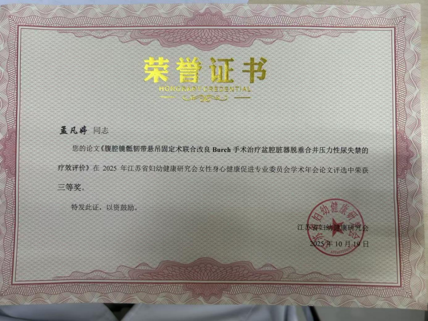 近日,苏州高新区人民医院妇科周素芳主任团队成员孟凡婷的研究论文《腹腔镜骶韧带悬吊固定术联合改良Burch 手术治疗盆腔脏器脱垂合并压力性尿失禁的疗效评价》》在2025年江苏省妇幼健康研究会女性身心健康促进专业委员会学术年会论文评选中荣获三等奖。