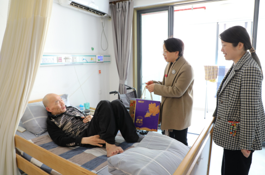 慰问组一行首先来到吴金土所在的养老院。李惠芬主席亲手送上医院的关怀与祝福,并亲切询问吴爷爷的身体状况与生活起居。吴爷爷激动不已,连连致谢,对医院始终如一的牵挂与关爱表示由衷感激。