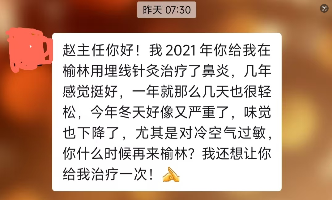 时隔5年,这位患者再度联系,反馈当年疗效持久,症状消失,今冬冷空气刺激后稍有反复,期盼赵主任能再次前来施治。短短几句话,不仅是对过往治疗的肯定,更是一份跨越时间与地域的信任。