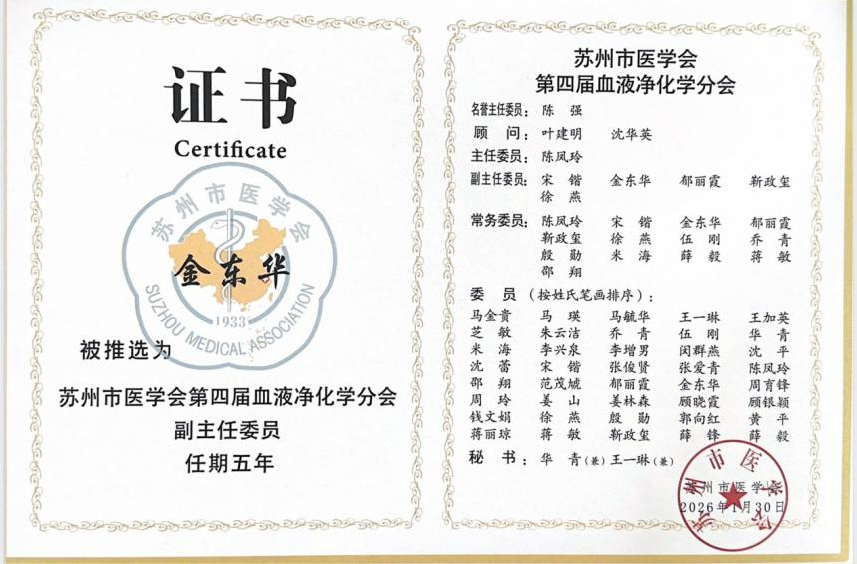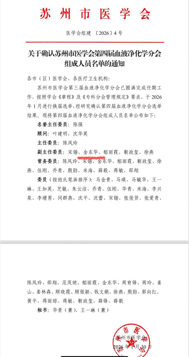 喜讯!苏高医金东华博士连任苏州市医学会血液净化学分会副主委