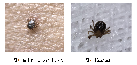 近日,苏州高新区人民医院接诊了一名15岁男孩,周末到河边钓鱼,回家后晚上洗浴时发现左小腿内侧多了一颗芝麻大小的“黑痣”——仔细一看,有一只虫子,通过网络搜索发现是蜱虫。此时,蜱虫的头部已经深深钻进了皮肤里,虫体明显胀大。来院后医生先用碘伏局部消毒,再用镊子小心夹住蜱虫的头部拔出完整的虫体(见下图)。