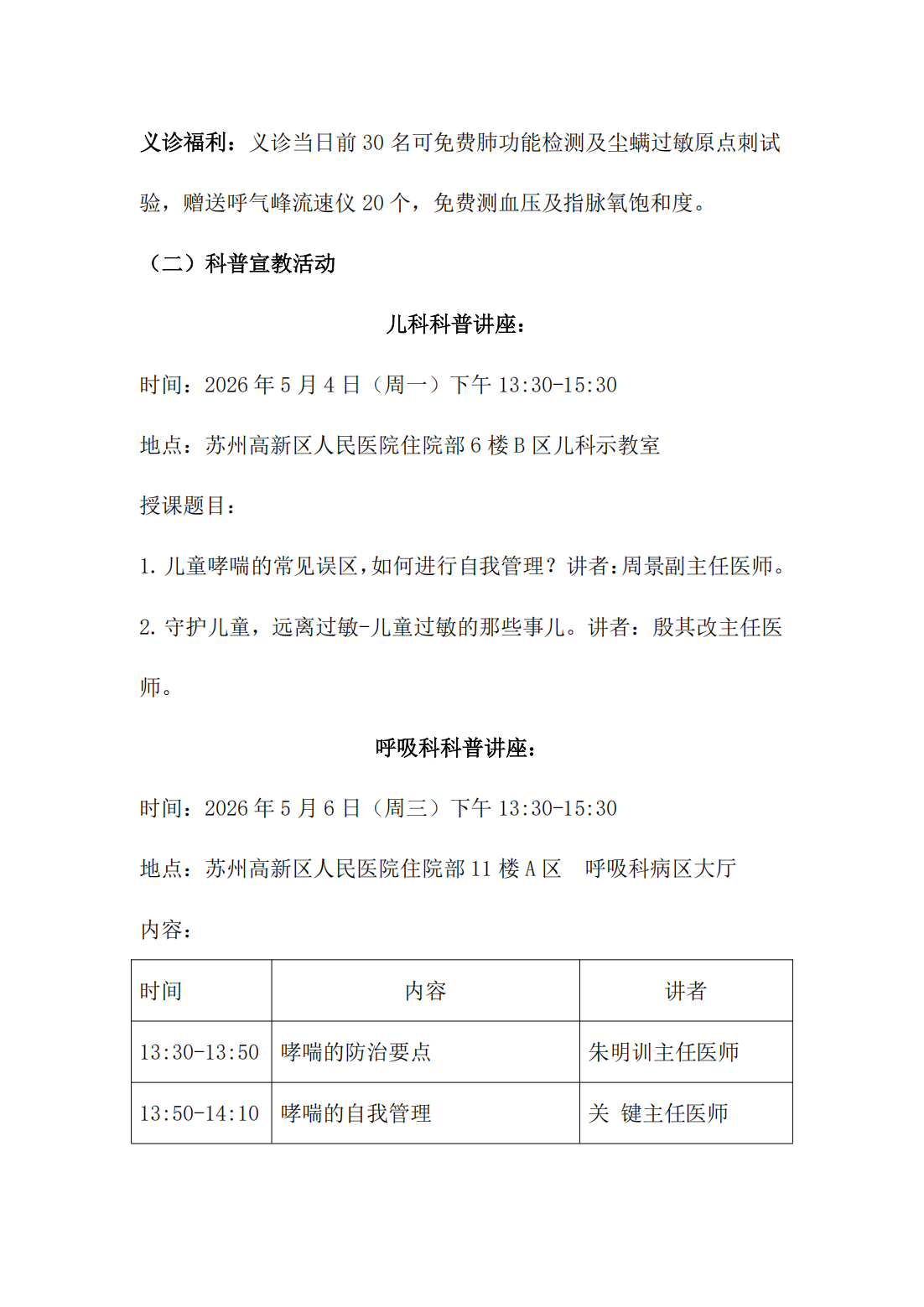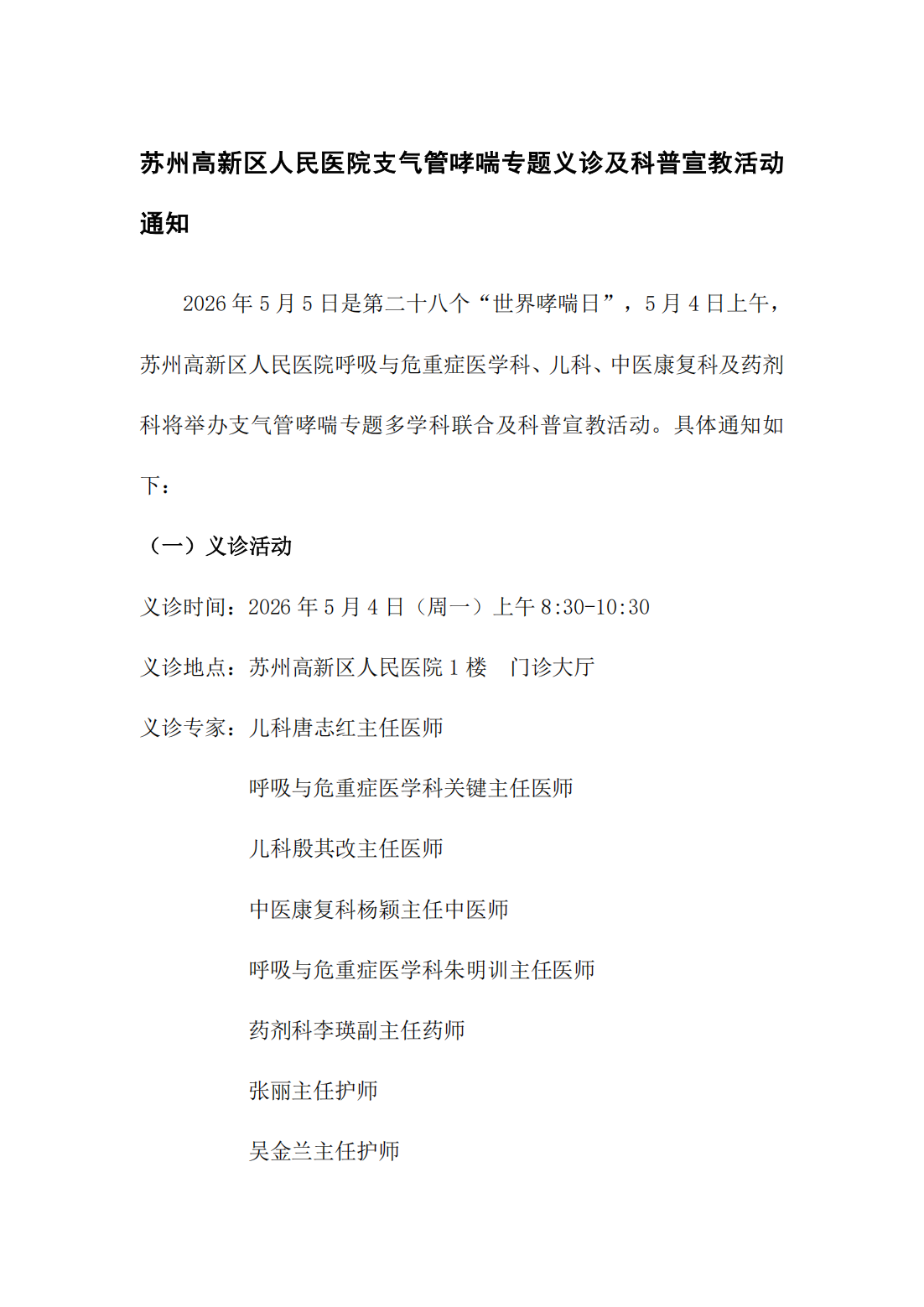 苏州高新区人民医院支气管哮喘专题义诊及科普宣教活动 通知