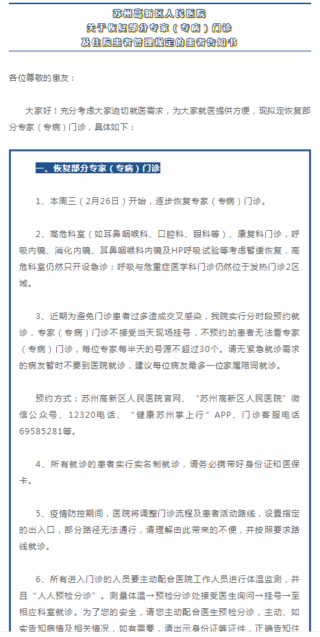 高新区发布:苏州高新区人民医院 关于恢复部分专家(专病)门诊 及住院患者管理规定的患者告知书