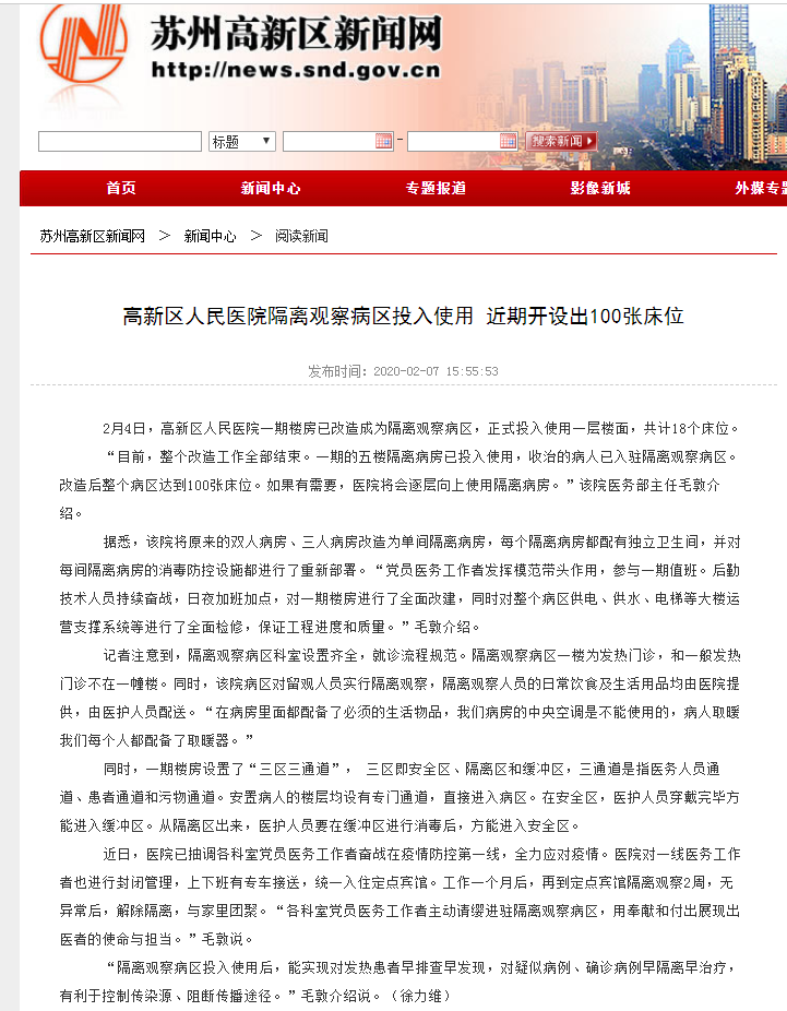 2月7日,高新区新闻网报道我院隔离病区投用。