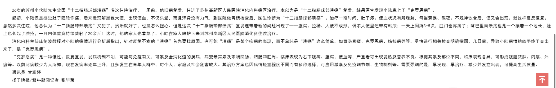 11月19日,扬子晚报报道我院消化内科诊治“克罗恩病”患者,科主任庄剑波教授科普疾病知识。