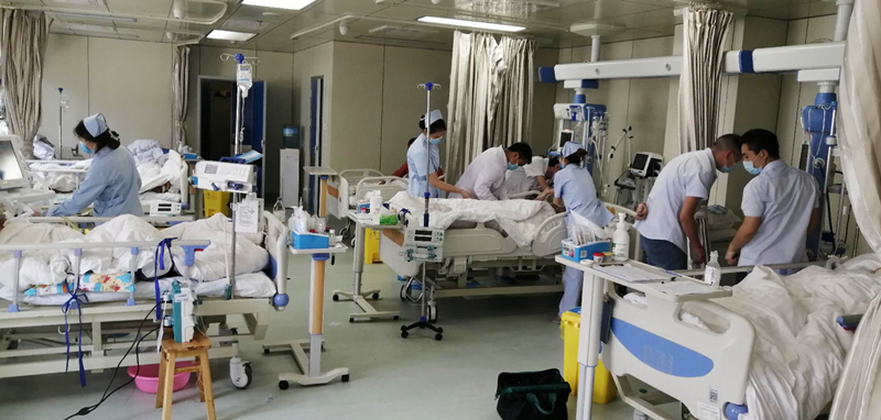 初来的时候,因为新冠肺炎疫情影响,万山区人民医院重症医学科医务人员全部充实到抗疫一线:有的被派去援鄂,有的在发热门诊,有的在隔离病房。我刚来的时候,被安排在呼吸科病房工作。当天就接诊了一位危重症患者,临时在呼吸科组建了监护病房进行监护治疗。后来又陆续有不少危重病人,特别是术后的重症病人转进来,我就和呼吸科的医护人员一起,在这个临时组建的监护病房内展开危重症患者的救治工作。后来随着疫情控制平稳, 4月20日,重症医学科医务人员全部到位,正式恢复开科。